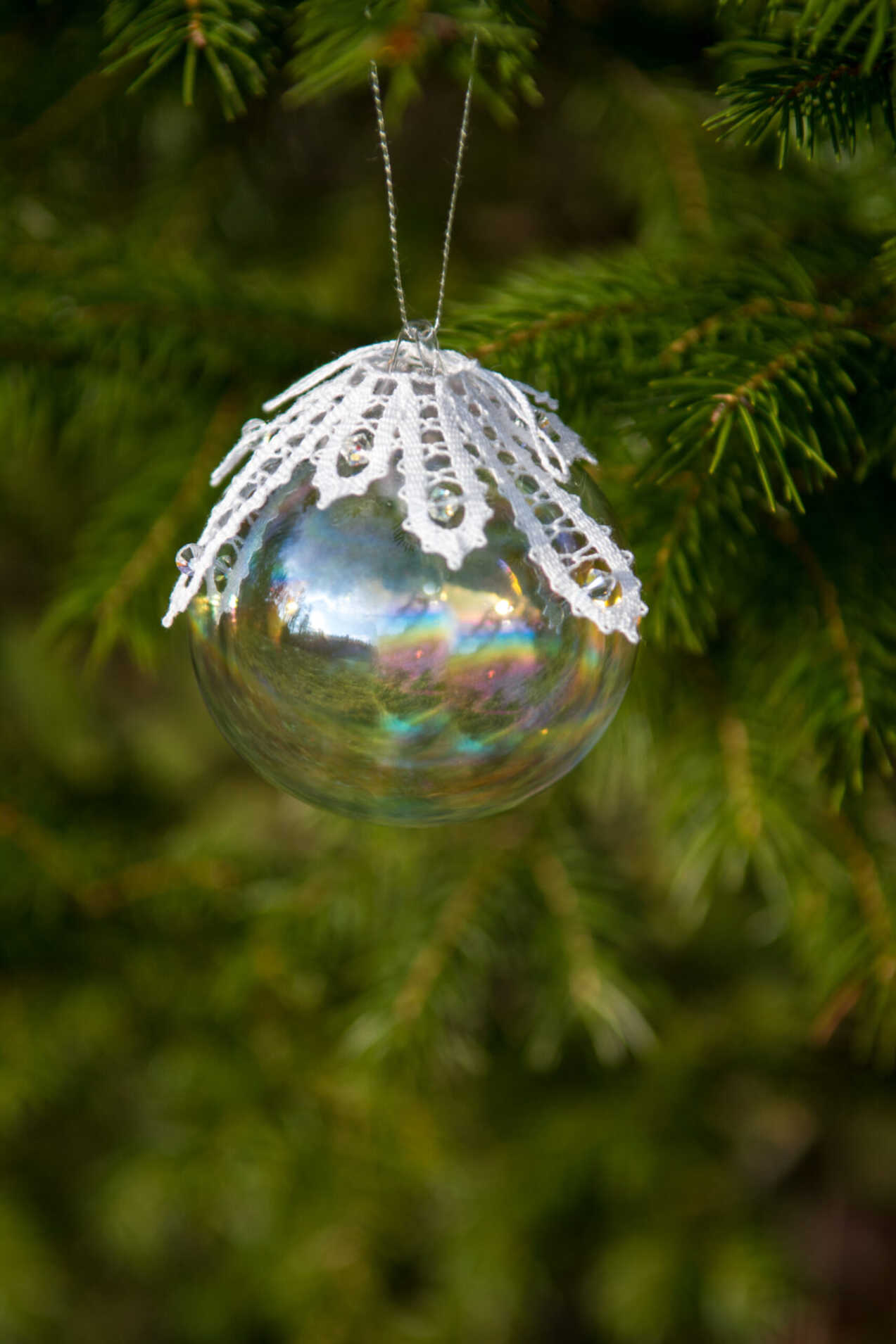 Steklen balonček, ki ga krasi ročno izdelana idrijska čipka z vklekljanimi  kristali Swarovski, je prestižen okrasek za novoletno jelko.