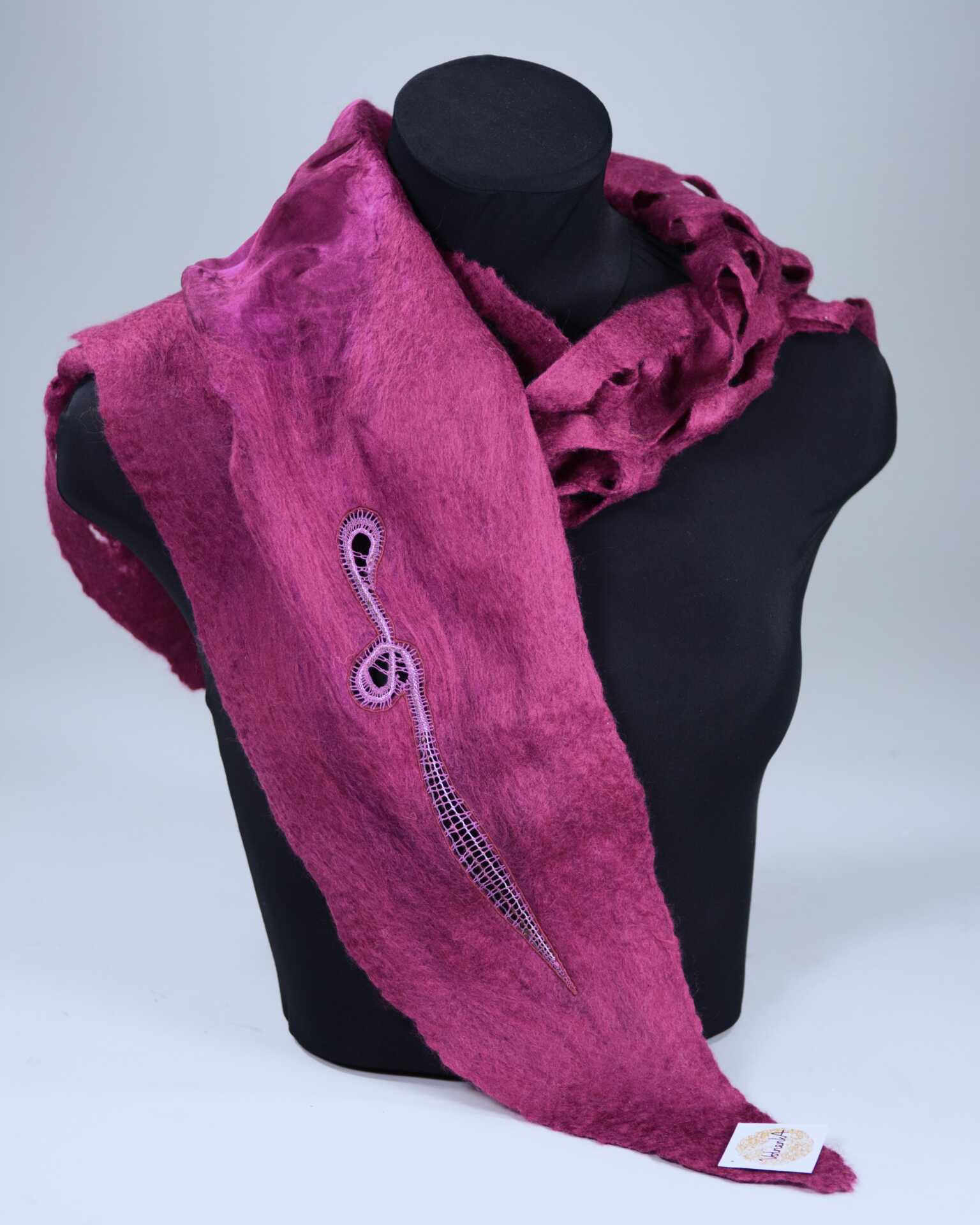 The scarves are created using the felting technique, where 100% natural silk is embedded between a combination of fine merino and alpaca wool. This distinctive processing method allows for the inclusion of authentic Idrija Lace, which is made from metallised and cotton thread, lending the scarves an exceptional visual and textural quality.