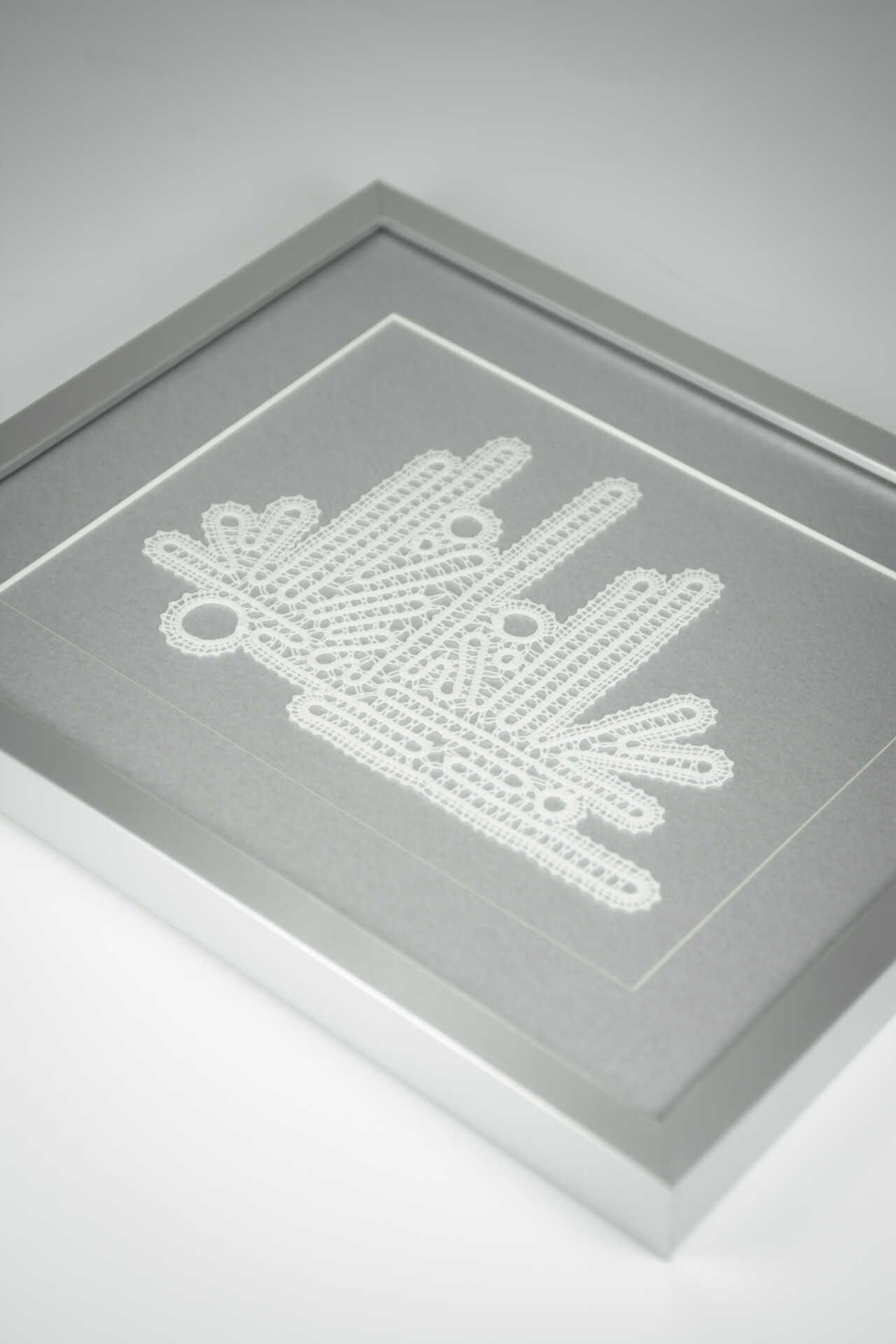 Uokvirjena visokokakovostna ročno klekljana idrijska čipka.