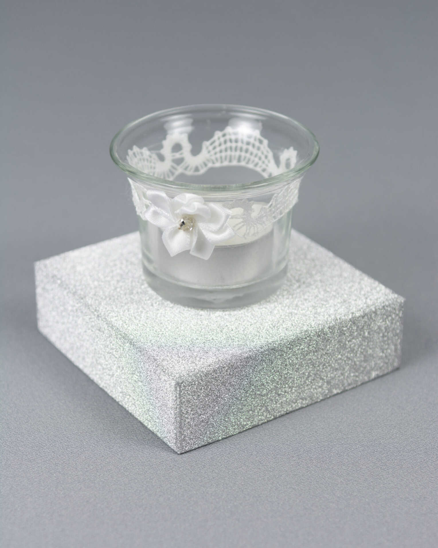 Steklen svečnik za čajno svečko z ročno klekljano idrijsko čipko.