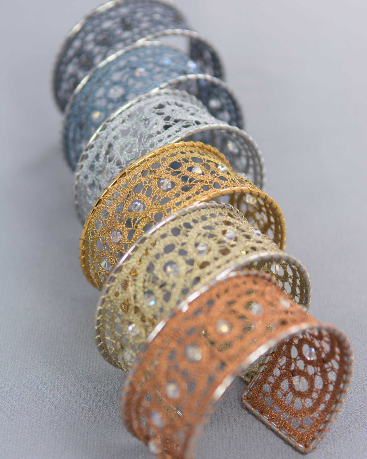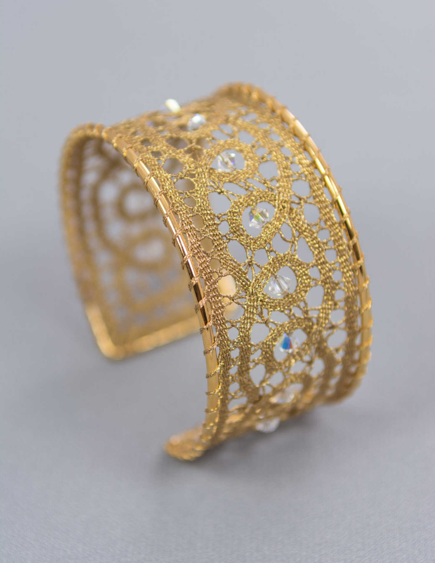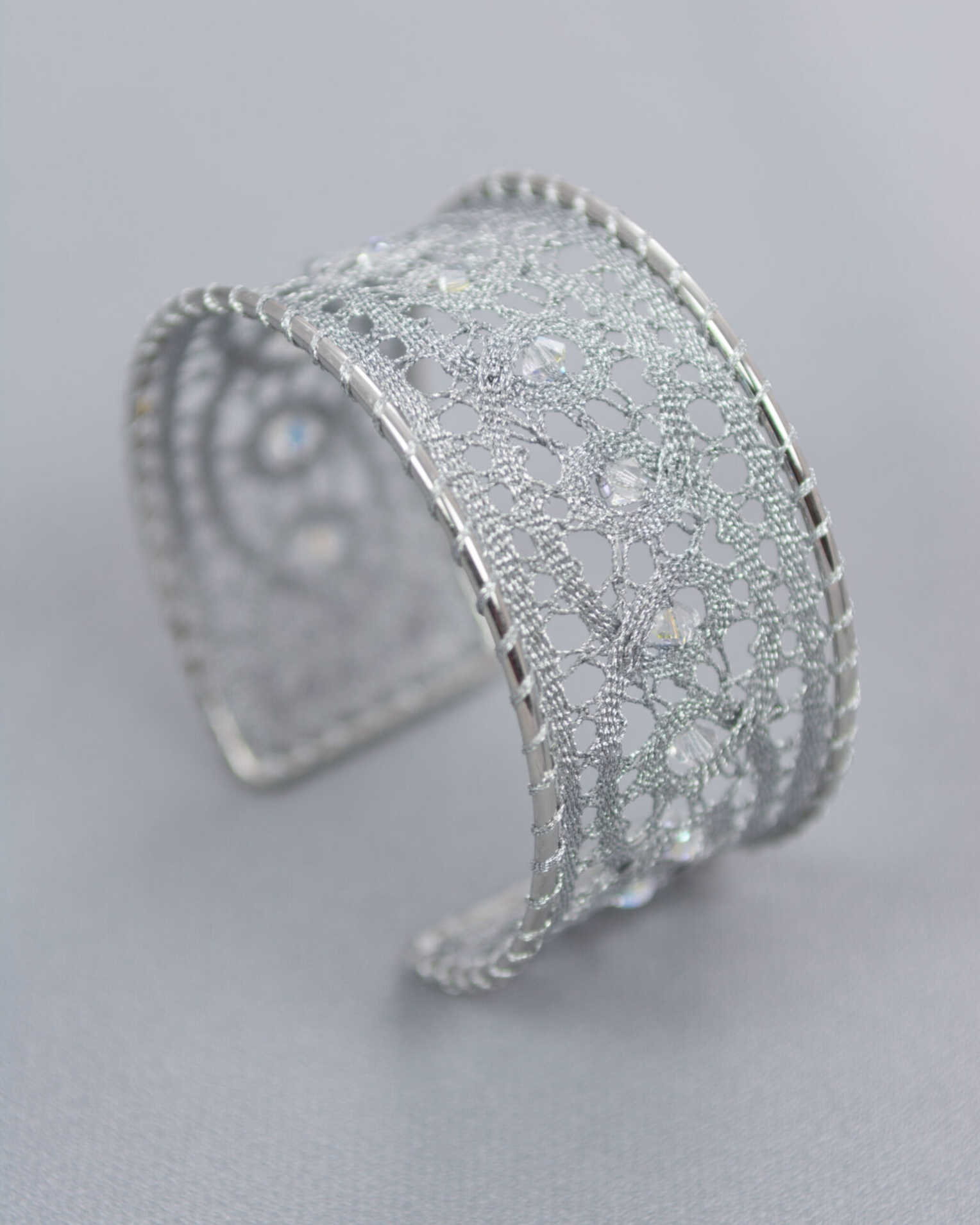 Handmade bobbin bracelet in a ring, made of shiny thread with added Swarovski crystals.