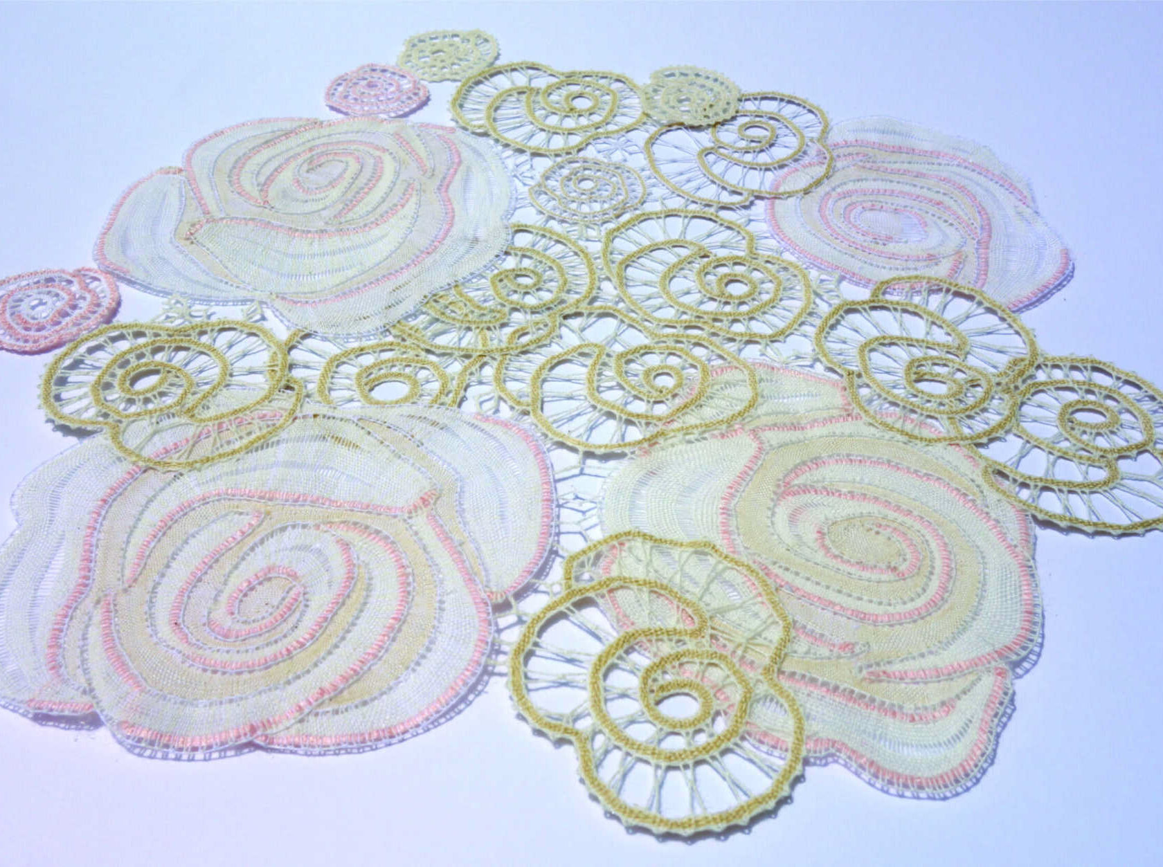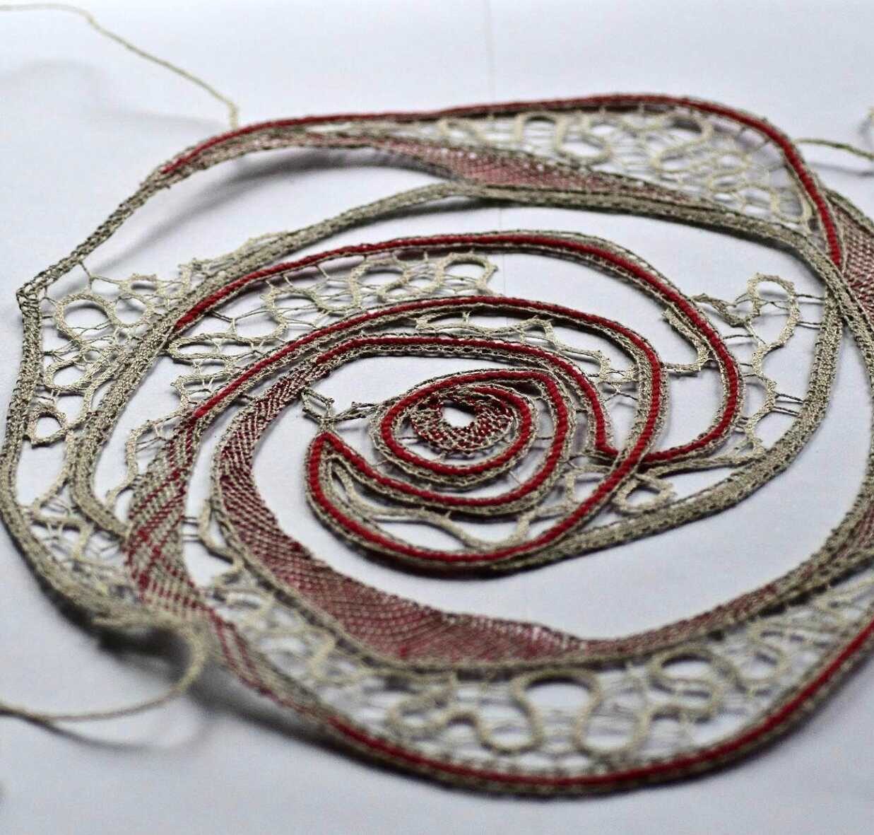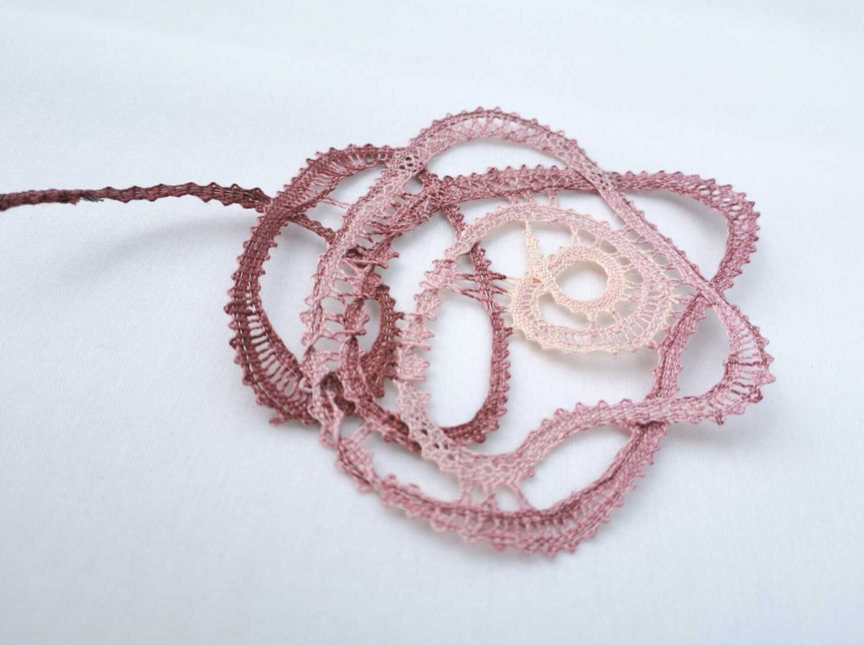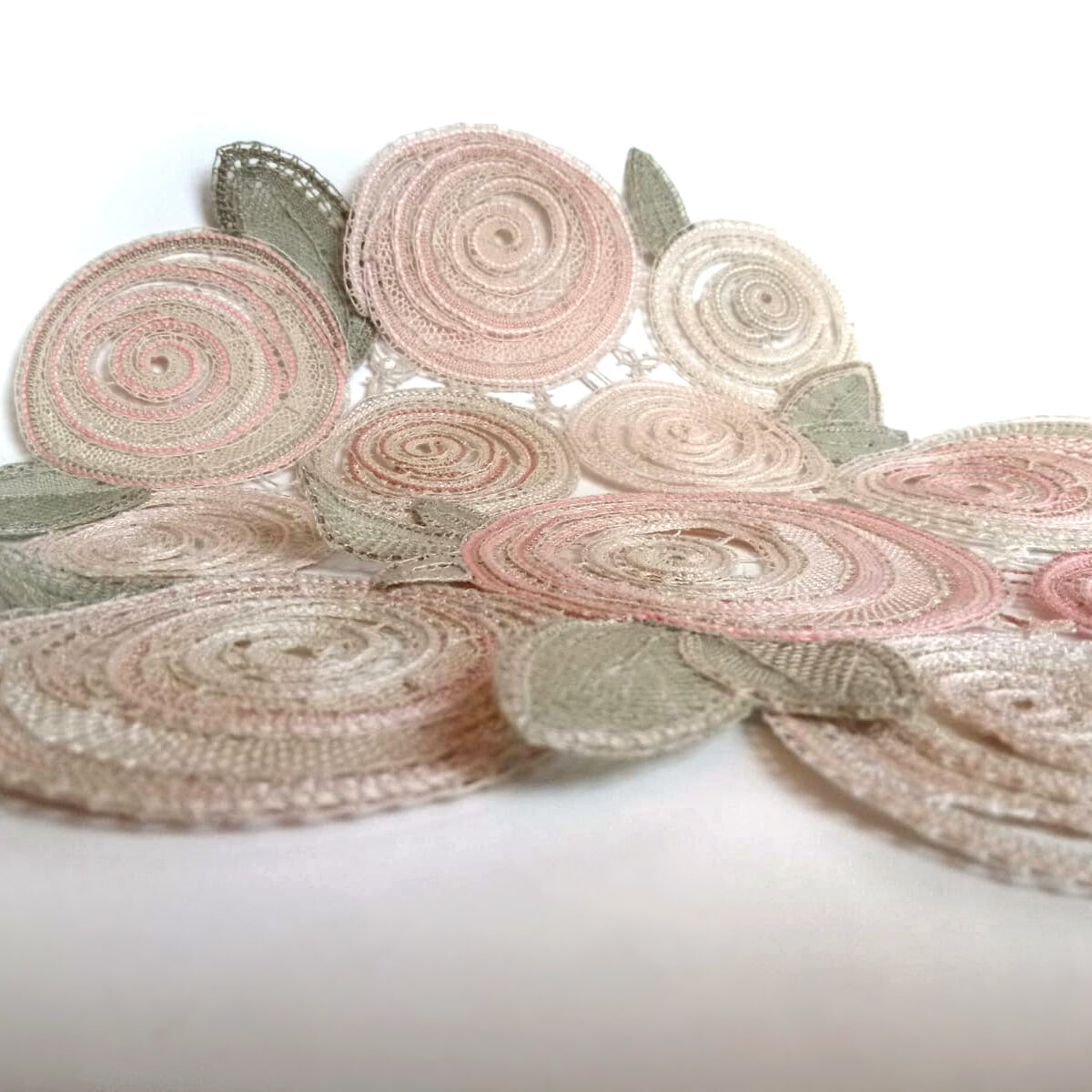 Eva je ustvarila asemblaž korona vrtnic iz različnih čipk, ki pa bi jih želela nadgraditi s klekljanimi vrtnicami v tehniki idrijske čipke in naše klekljarice iz skupine so se z veliko vnemo lotile projekta.
